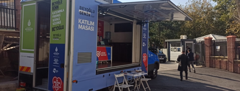 Katılım Masaları, İBB mobil iletişim aracında yer alıyor. Masalarda, gün boyunca Beyoğlu sakinleri ve ziyaretçiler ile görüşmeler yapılacak ve Beyoğlu Senin planlama süreci ile ilgili bilgi vereceğiz. Beyoğlu’nun ve mahallenizin sorun ve ihtiyaçlarını harita üzerinde tespit etmek amaçlı çevrimiçi olarak mekansal sorun ve öneri işaretleme ve mini anket çalışmaları yapacağız. Dilerseniz kayıt gerektiren mahalle etkinliklerimiz için de kayıt yaptırabileceksiniz.