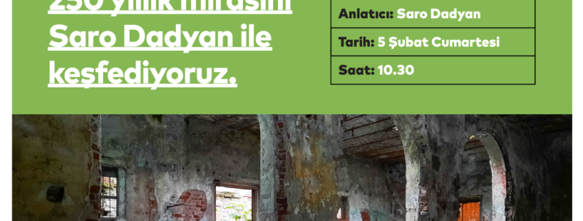 Beyoğlu Senin etkinlikleri kapsamında 5 Şubat Cumartesi günü Saro Dadyan anlatıcılığında gerçekleşecek kültürel miras turu için başvuru formundan kayıt yaptırabilirsiniz. İki saat sürecek tur için saat bilgisi rezervasyon maili ile iletilecektir.