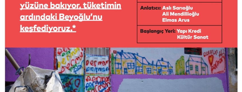 Beyoğlu’nda kültür, eğlence, yeme-içme mekânlarındaki süregiden üretim ve tüketim, her gün devasa boyutta atığın ortaya çıkmasına yol açıyor. Barlardan ve lokantalardan çıkan cam, yayınevlerinden çıkan kâğıt, büyük giyim mağazalarından çıkan tekstil atıkları nereye gidiyor, nerelerde bekliyor? Bu yürüyüş rotası, katılımcıları Beyoğlu’nun bu pek görünmeyen yüzüne bakmaya, kullanılan kaynaklardan arta kalanların kenti nasıl etkilediği, hangi mekanizmaların ortaya çıkışına neden olduğu konusunda düşünmeye teşvik ediyor. Yapı Kredi Kültür Sanat’ın Galatasaray’daki merkezinde başlayıp Tarlabaşı-Dolapdere yönünde devam edecek olan yürüyüşün anlatıcıları “Araf’ta Bir Beyoğlu” projesi ekibinden araştırmacı Aslı Sarığlu, Geri Dönüşüm İşçileri Derneği’nden Ali Mendillioğlu ve Sıfır Ayrımcılık Derneği’nden Elmas Arus.